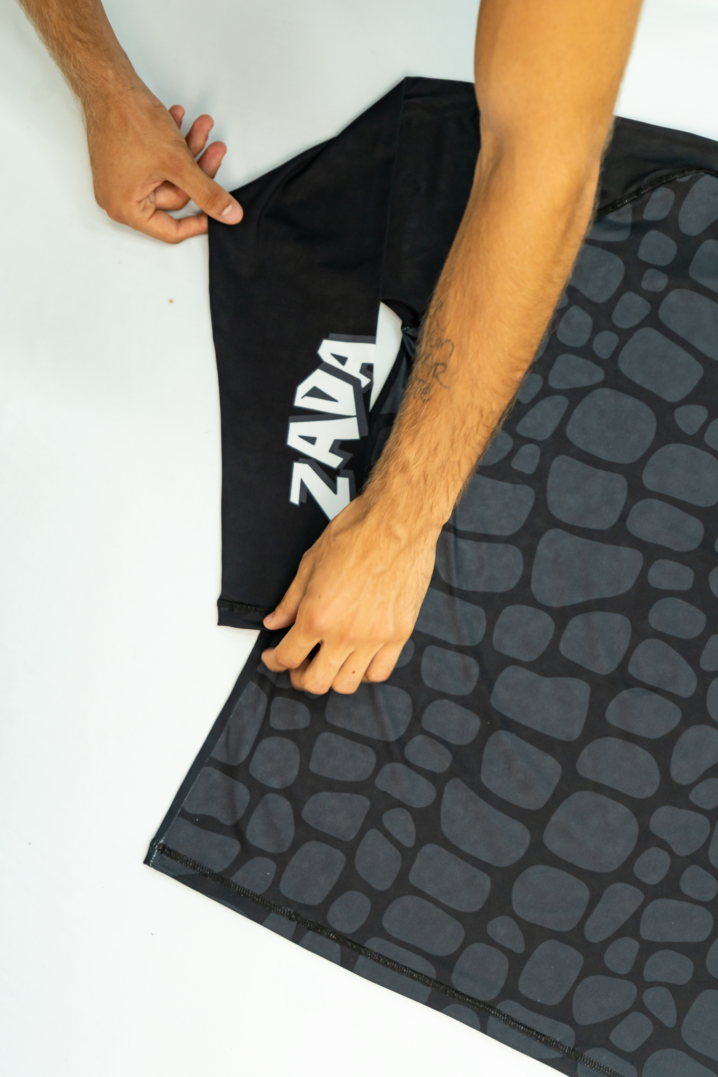 Poliamida com proteção UV50+ e ação antibactericida. Composição: 91% poliéster, 9% elastano..